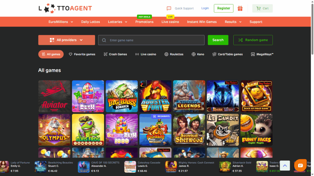 Если ищете площадку с упором на лотереи и широкий выбор дополнительных игр, обратите внимание на Lotto Agent. Компания принадлежит Agento N.V., имеет лицензию Anjouan Gaming и позиционируется как небольшое казино с годовым оборотом свыше миллиона долларов. Многообразие игр – результат сотрудничества с более чем сотней провайдеров, среди которых NetEnt, Pragmatic Play, Novomatic, Playtech и Evolution Gaming. Представлены не только слоты, но и рулетка, блэкджек, видео-покер, кено, бинго, live-игры, виртуальный спорт и карточные развлечения. При этом часть контента может быть недоступна для некоторых стран, что важно учесть при выборе.