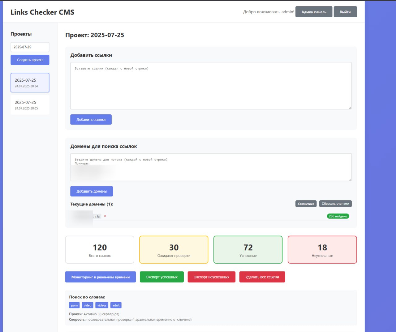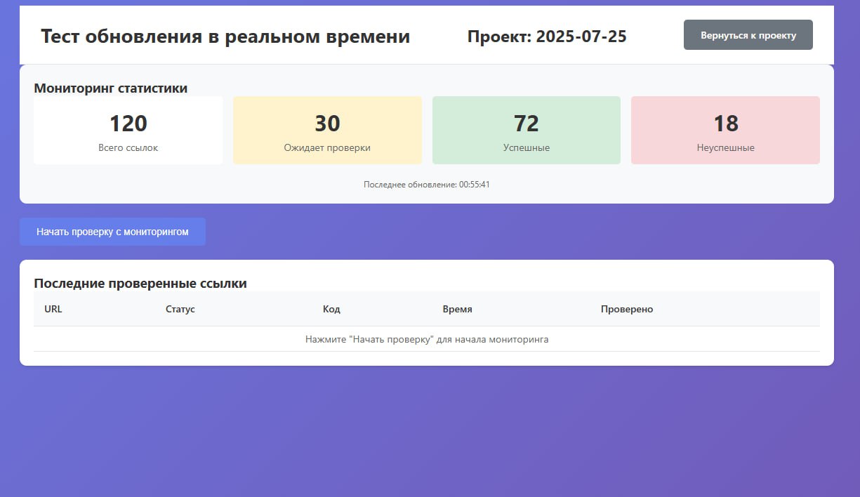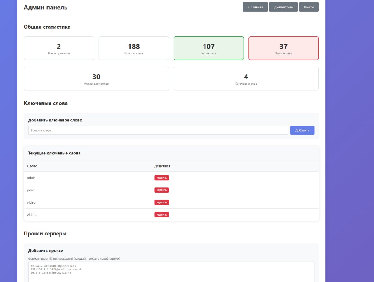 El sistema es una aplicación web para la verificación automática de listas de enlaces con soporte para servidores proxy, búsqueda de palabras clave y seguimiento de enlaces externos.