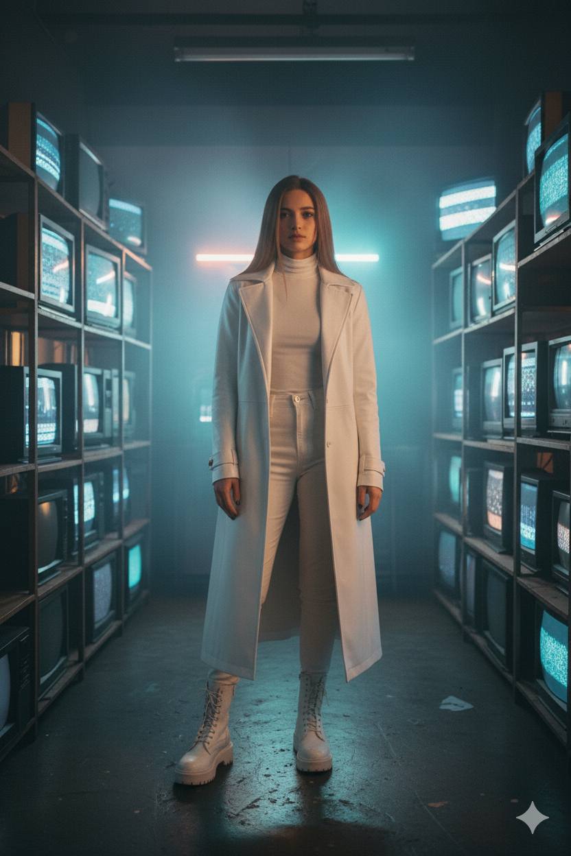 A wider cinematic shot of a confident woman standing in a dim vintage room filled with flickering CRT TVs. She wears a long black leather trench coat over a fitted turtleneck and high-waisted trousers, heavy boots glinting in the shifting light. Cold blue and amber glow from the screens moves softly across her face and coat. Smoke drifts lazily through the air. Her gaze is calm but untouchable — a modern noir heroine. The scene feels cinematic and moody, captured on ARRI Alexa Mini LF, 35mm lens, tone: Americana Night Fog — retro Americana palette with warm red and teal neon contrast, halation bloom, soft haze diffusion, low-contrast shadows, subtle film grain, Kodak Vision3 500T emulation, realistic fog texture, wet asphalt reflections.