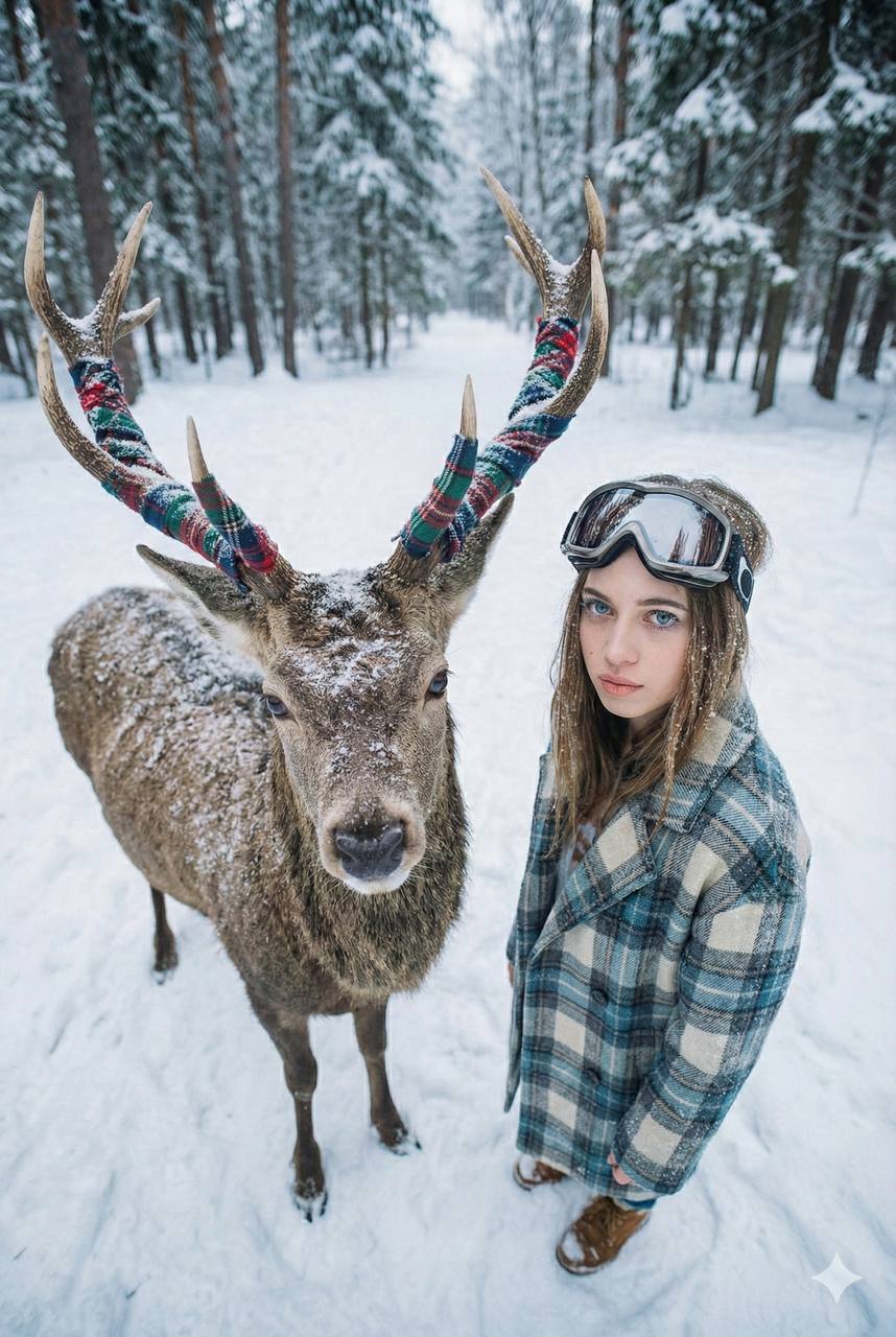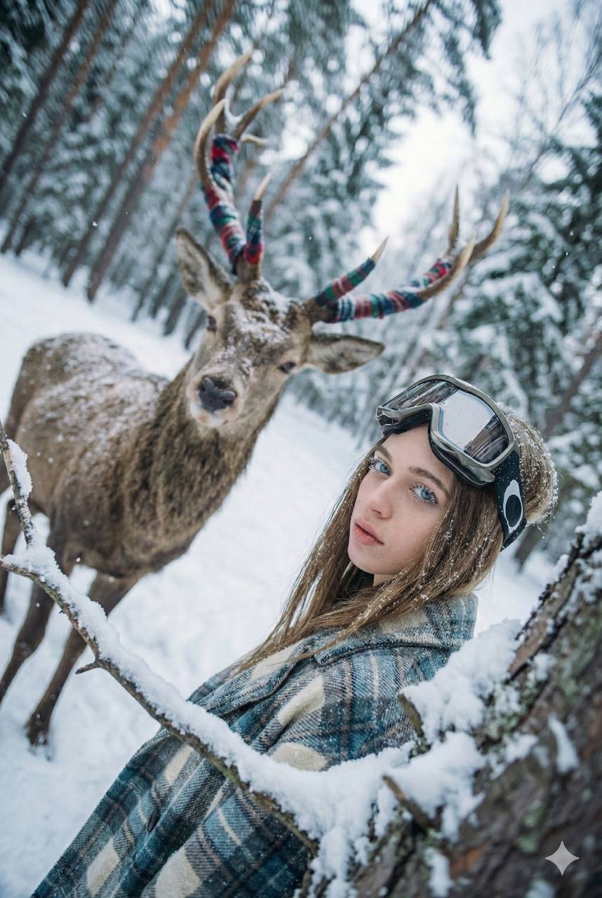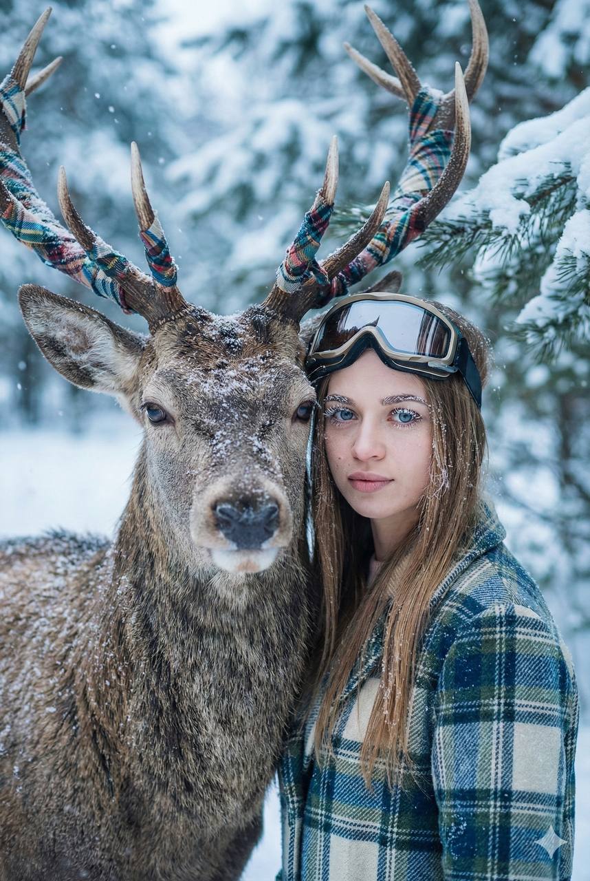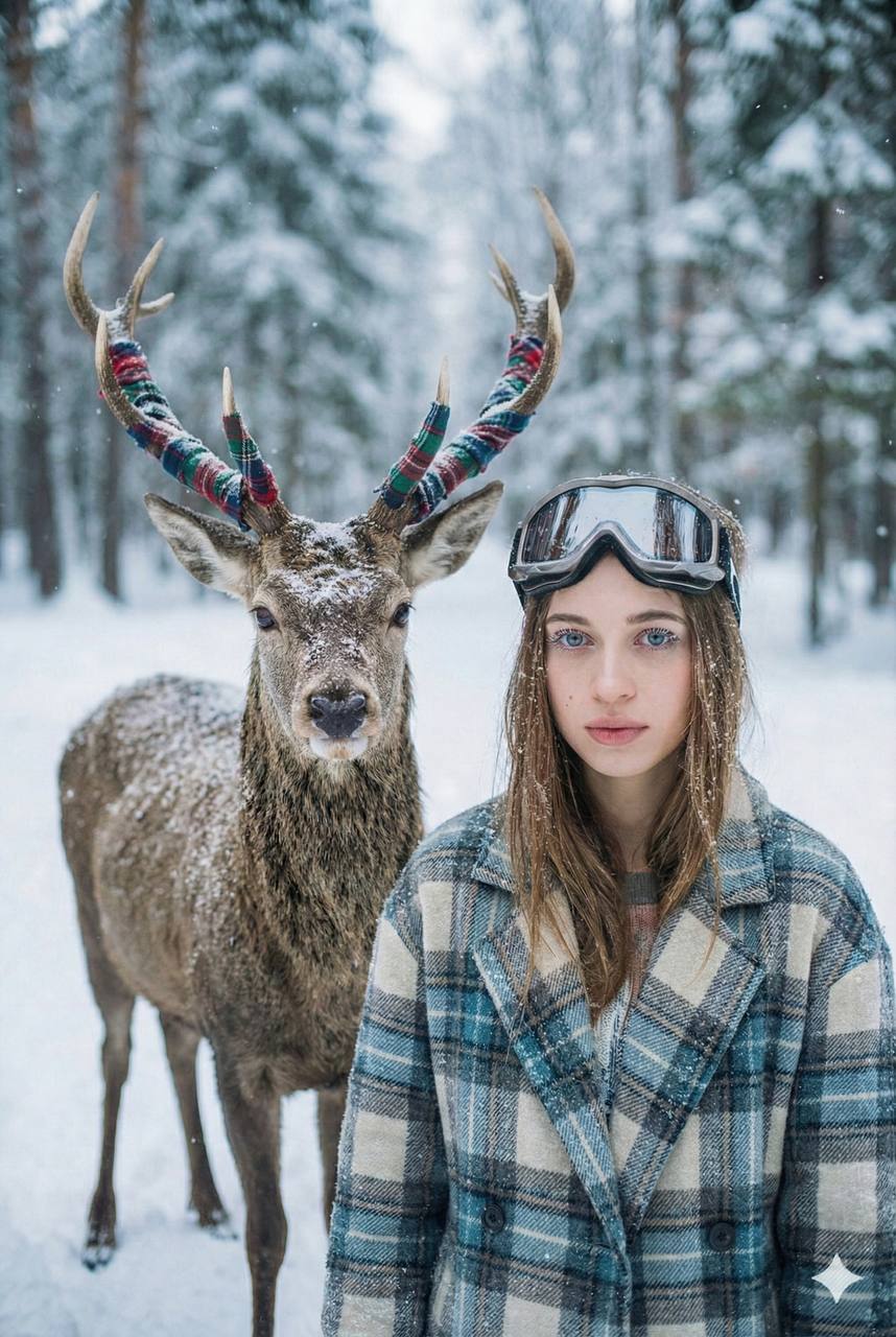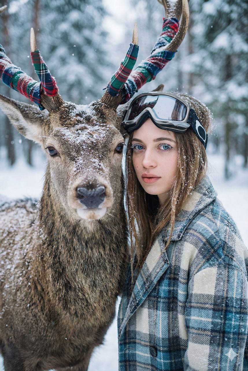 Create a hyper-realistic 8K winter fantasy portrait in a snowy forest. Main subjects: A young ethereal woman and a majestic deer standing very close together, both looking directly into the camera, creating an intimate, surreal connection with the viewer. Woman: Face and facial geometry are strictly taken from the uploaded selfie. Preserve exact portrait likeness: face proportions, bone structure, eyes, nose, lips, jawline. Do not change the face in any way. No beautification, no stylization, no facial reinterpretation. Cold winter frost effect on skin and eyelashes is allowed without altering facial features. Clothing and accessories may differ from the selfie: luxury ski goggles and a vintage wool plaid coat in cool winter tones. Direct eye contact with the camera. Deer: Lifelike winter deer with thick realistic fur dusted with snow. Large antlers creatively wrapped in colorful plaid fabric. Still, calm, intelligent gaze directed straight at the camera. Scene & atmosphere: Snowy pine forest, soft drifting snowfall. Background softly blurred with cinematic depth of field. Mood: surreal, quiet, intimate winter fantasy. Lighting: Cold cinematic lighting with soft facial highlights. Cool blue-white ambient tones and subtle rim light enhancing winter textures. Visual style: Hyper-realistic winter fantasy drama. Ultra-detailed textures: snow-dusted fur and hair, realistic skin, frost details, rich plaid fabric. Looks like a still frame from a high-budget fantasy film. Output: Editorial cinematic portrait, ultra-high detail, 8K quality. Format 2:3.