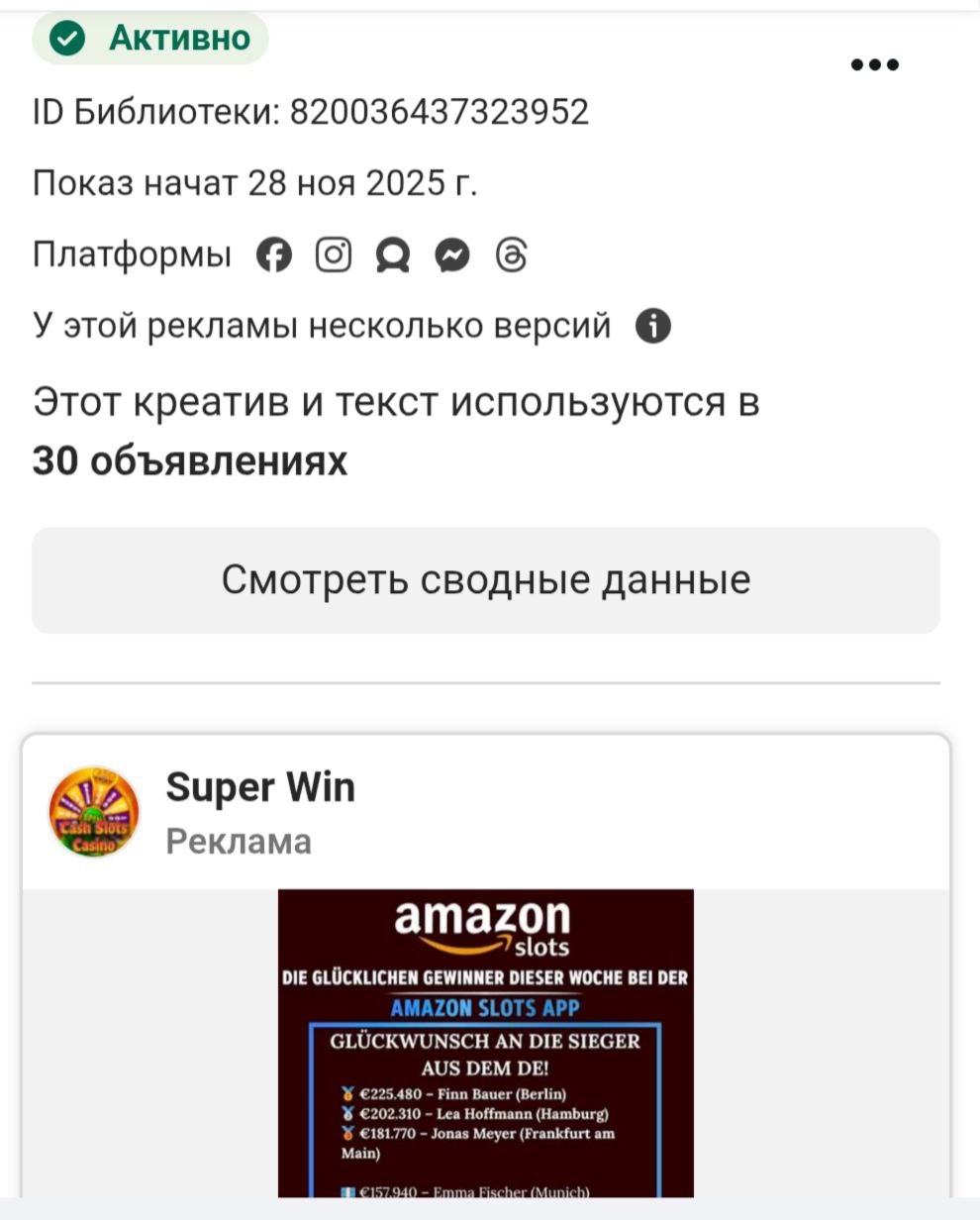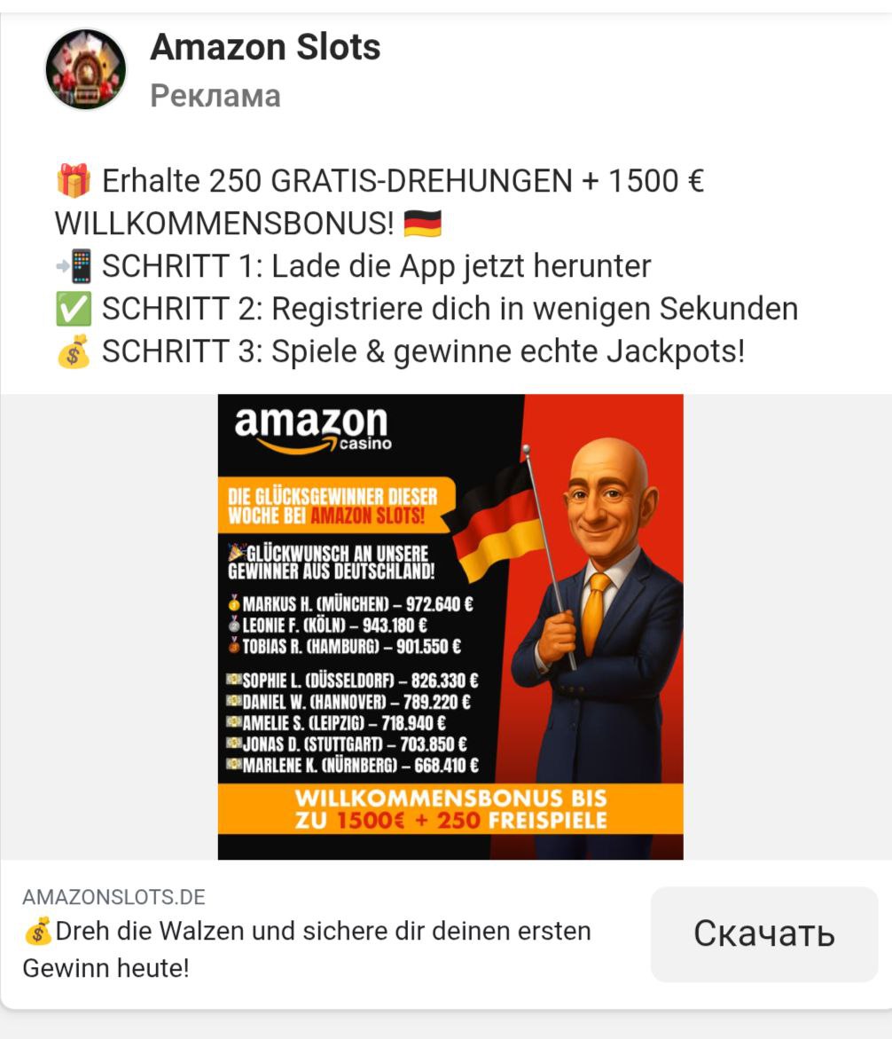 - Журналисты негодуют от того, что в Facebook, Instagram, даже в Google Ads массово появляются крео под Amazon Slots, Amazon Slot Casino и прочие вариации названия.
