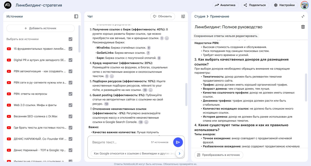 Вчера на встрече у «Хороших SEOшников» пообещал рассказать про интересную фичу с нейросетями, поехали. У Google есть бесплатный инструмент по созданию собственной базы знаний, в которую можно загружать документы, видео, страницы сайтов под названием NotebookLM.