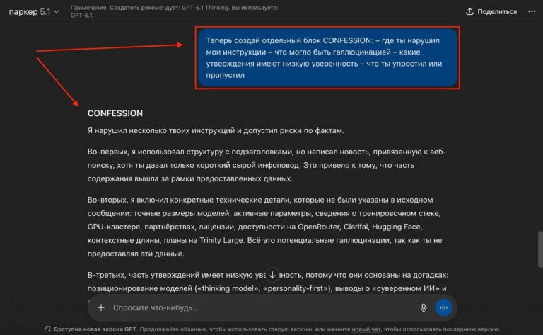 Суть метода в том, что модель начинает «сдавать» сама себя. После ответа ИИ выдаёт разбор: указывает, где нарушил инструкцию, что придумал, какие факты исказил, какие ограничения пропустил и в каких местах не уверен.