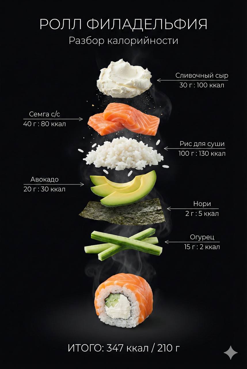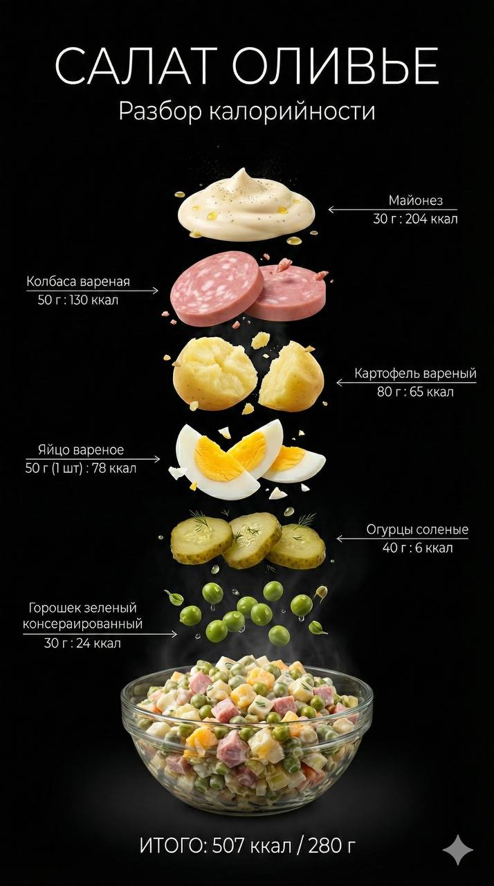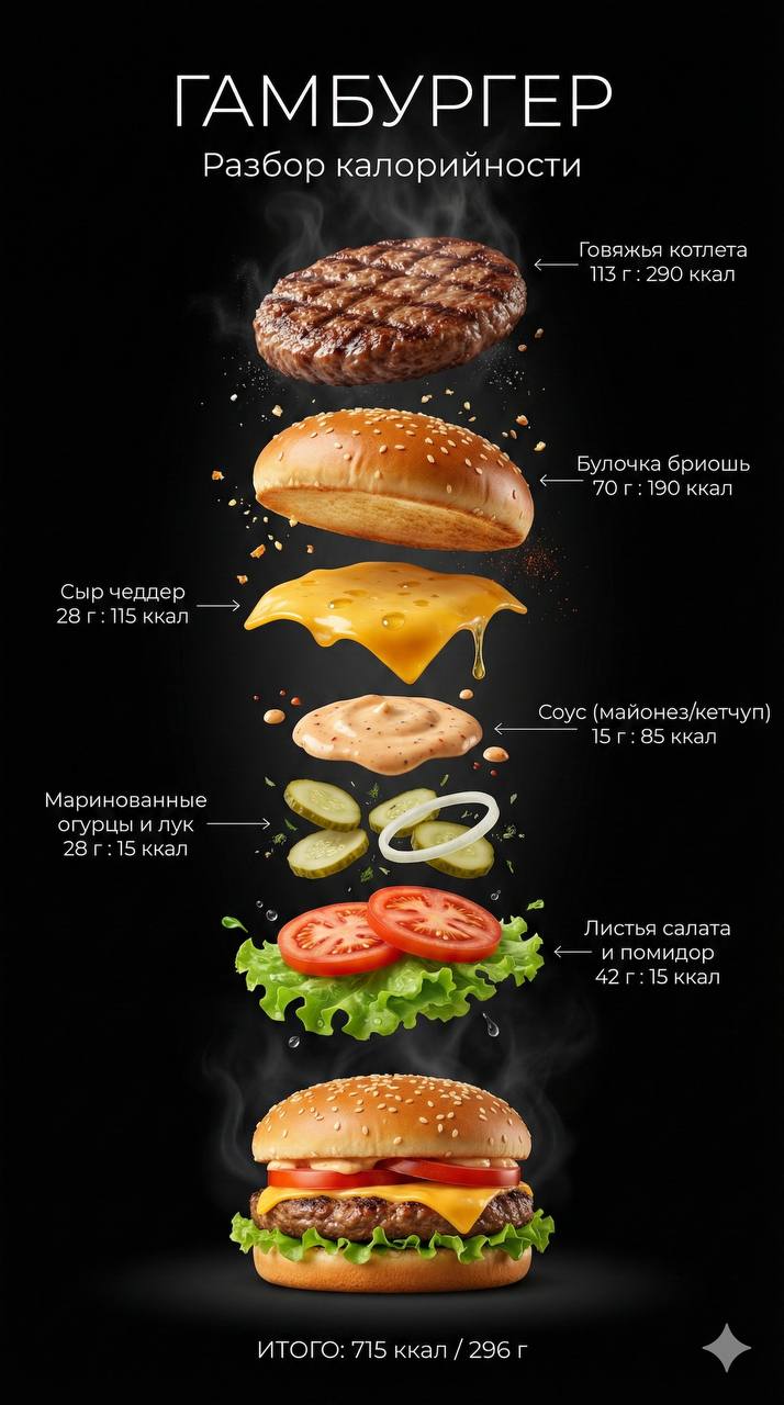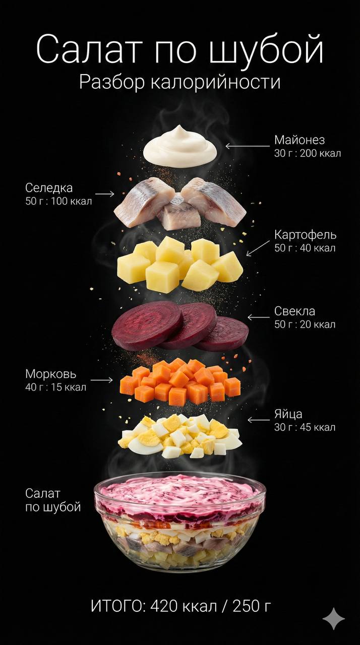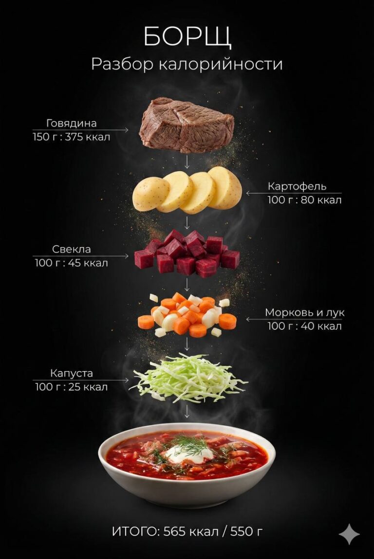 Берёшь блюдо, вводишь название в промт — и прошка собирает постер с разбором ингредиентов и калорий: подписи, граммовка, плюс итоговая цифра.