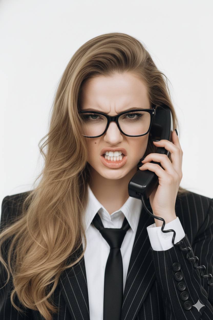 Reference image: uploaded photo. A cinematic fashion editorial scene in a minimalist white studio. The background is seamless and clean, with a neutral white floor and bright front lighting softened by diffusion. A faint rim light from the top-left creates glossy reflections on hair and stockings. The woman sits confidently on a wooden office desk, legs crossed, leaning slightly forward. Her left hand rests on the laptop, right hand holds a classic office phone near the ear, with the cord visible. She wears a cropped pinstripe blazer with structured shoulders, a short high-waisted skirt, and a white shirt with a loosely undone black tie. Sheer black tights and dark red heels complete the look. Accessories: oversized black glasses, minimal jewelry, printed papers scattered on the desk. Hair: voluminous and glossy, styled in soft side-parted waves. Expression: focused and confident, lips slightly parted as if mid-conversation. Mood: cinematic office power — confident, sexy, intelligent energy. Camera: full-body 2:3 vertical framing, straight-on eye-level shot. Lighting temperature around 5500K. Add subtle cinematic motion blur, slightly softened edges, and shallow depth of field for a film-like look. Keywords: cinematic, fashion editorial, boss woman, modern retro, office aesthetic, realistic textures, soft blur, movie still.
