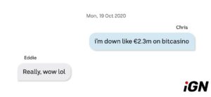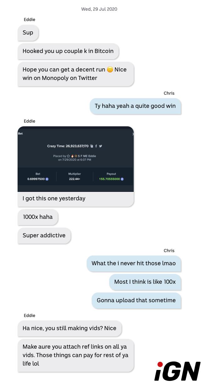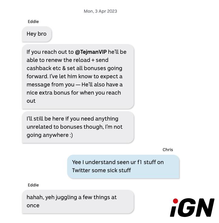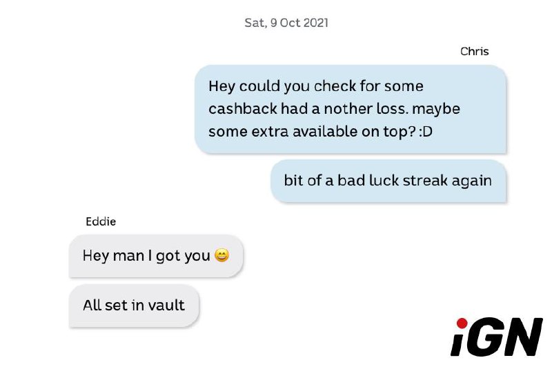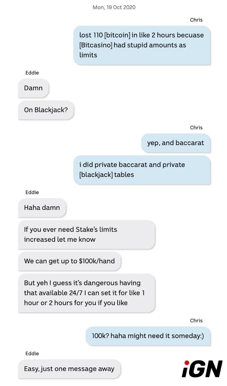 Переписка за 2020-2024 годы, опубликованная «ABC», показала, что в 2021 году Крис попытался самоисключиться и попросил Крейвена помочь обойти блокировку. Изначально Крейвен ответил, что это не лучшая идея, но вскоре одобрил VIP-привилегии на новом аккаунте якобы для друга Криса. Всего Крис успел создать семь аккаунтов, каждый из которых получил VIP-привилегии лично от Крейвена. В ноябре 2024 Крис написал Крейвену о проигрыше $700 тыс в блэкджек и попросил вернуть четверть суммы.