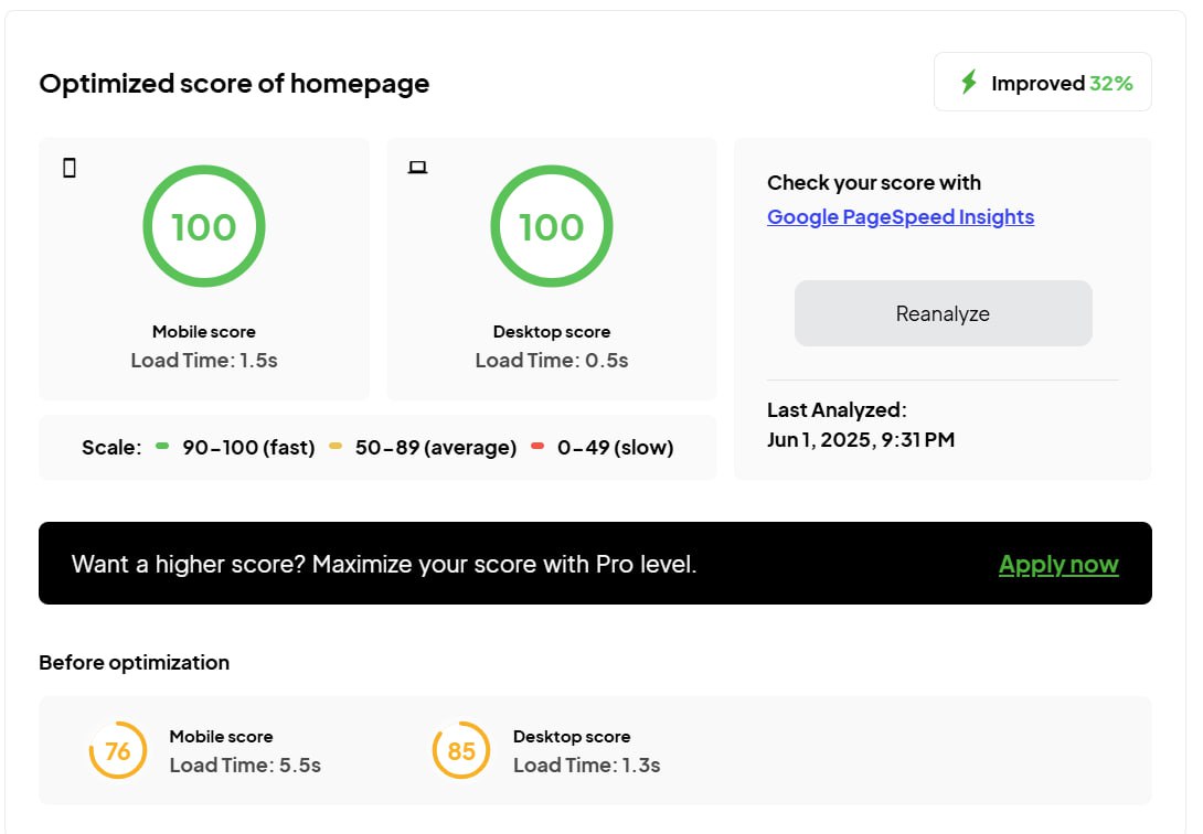 Протестировал уже на нескольких сайтах, полёт отличный, причём, сайты даже визуально стали открываться быстрей, не только циферки пейджспид прибавились Для примера, скинул скрин ускорения одного из моих сайтов на одном популярном шаблоне WordPress.