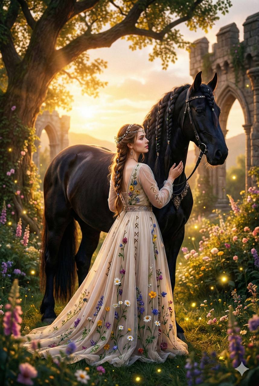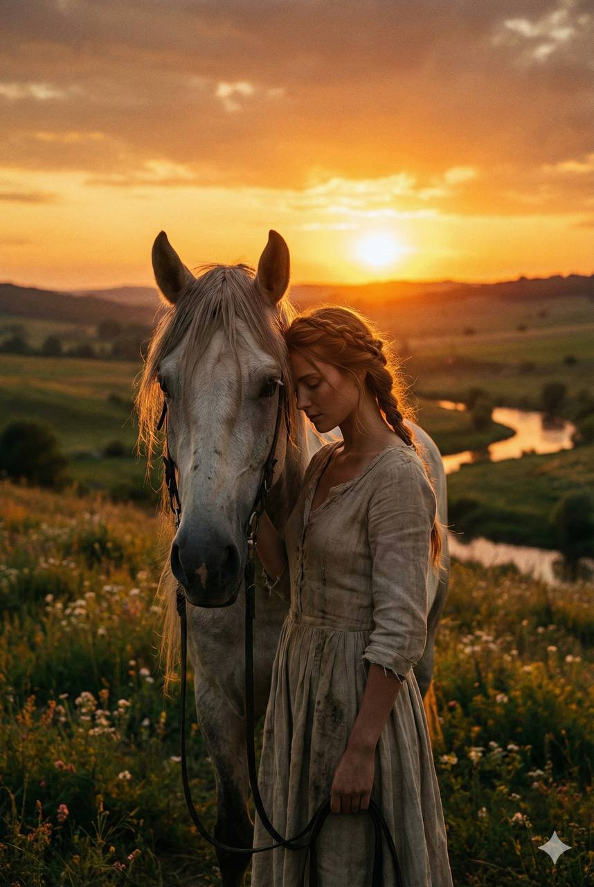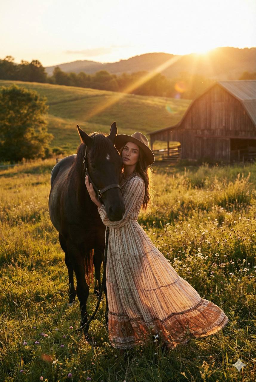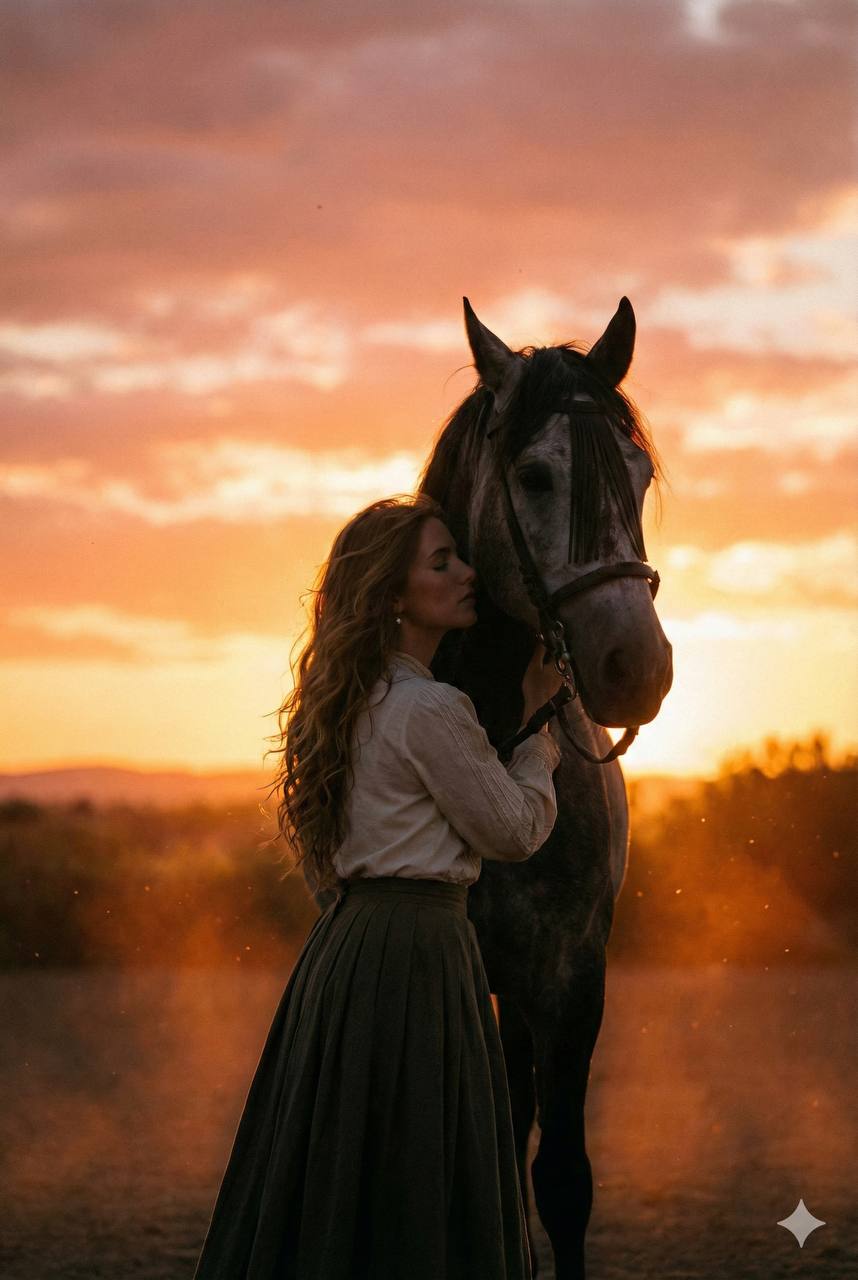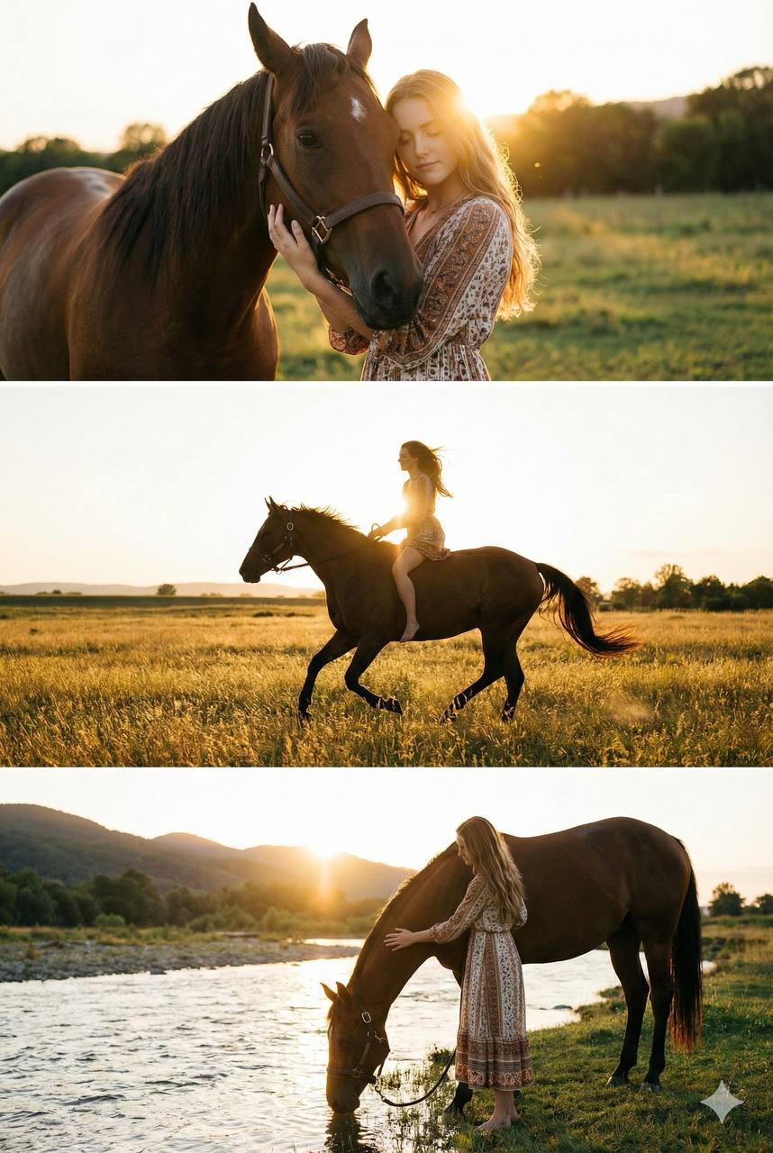 Вот смотрите, берём базовую задачу без деталей: «красивая девушка с конём на закате» — и проверяем, как меняется результат, если задать модели разные ЦЕЛИ: фотосет, рекламная съёмка, киношный кадр, сказочный визуал и портрет (прикреплённые фото в том же порядке).