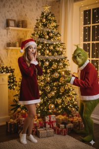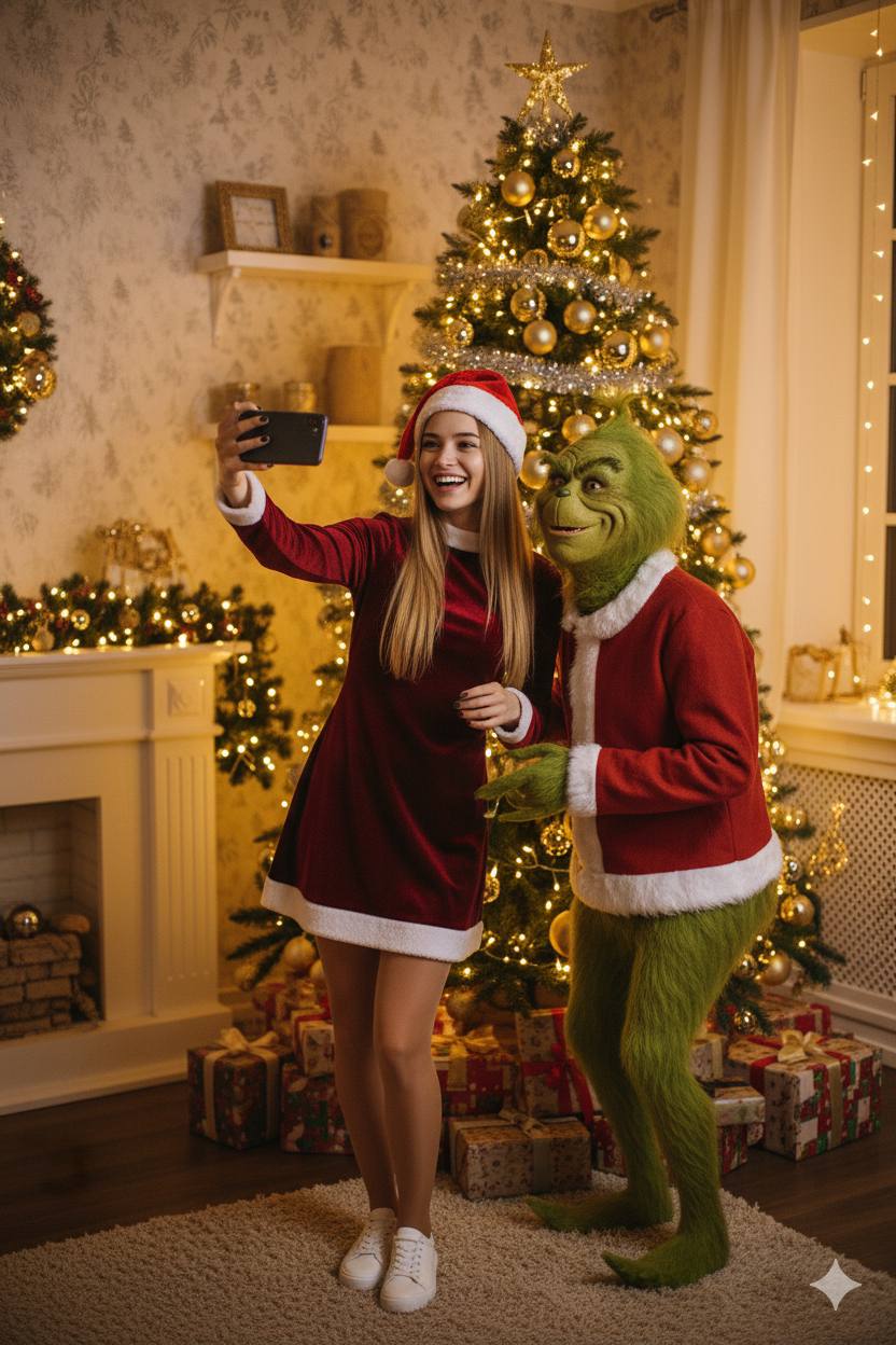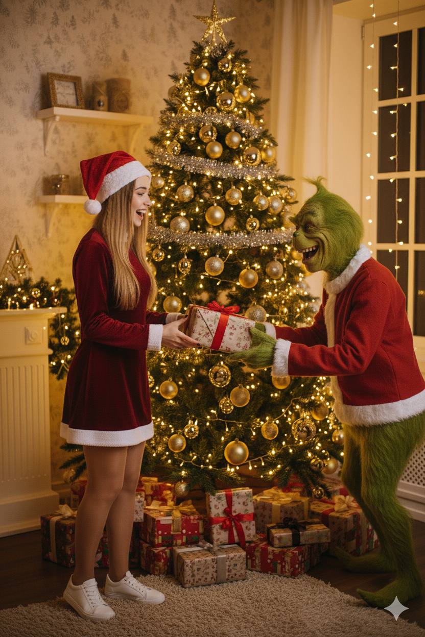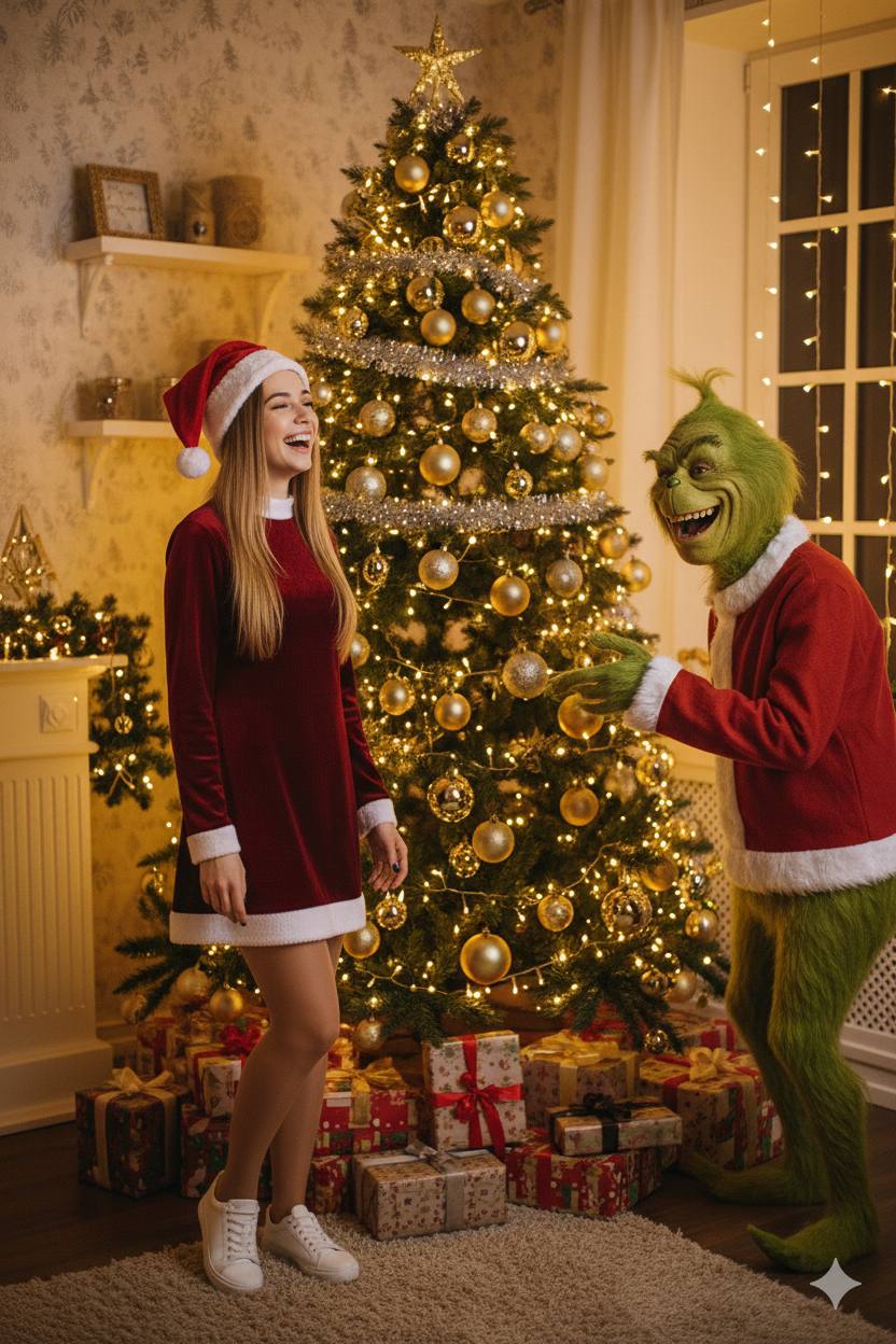 Use the person from the uploaded photo — keep the same face and body exactly as in the reference. Create an ultra-realistic, detailed image where this person is standing next to the Grinch, not touching. They are inside a cozy living room, beside a large decorated Christmas tree with golden and silver ornaments, warm lights, and many wrapped gifts underneath. The woman wears a festive red Christmas dress, a Santa hat, and white sneakers. The Grinch stands a little apart on one side of the tree, holding a lighter in his hand. Both are looking at the camera. The lighting is warm and soft, filled with golden glow and fairy lights, giving a cinematic Christmas feeling. Negative prompt: merged bodies, face changed, distorted features, blur, watermark, overlapping characters, harsh light, messy background, text.