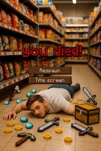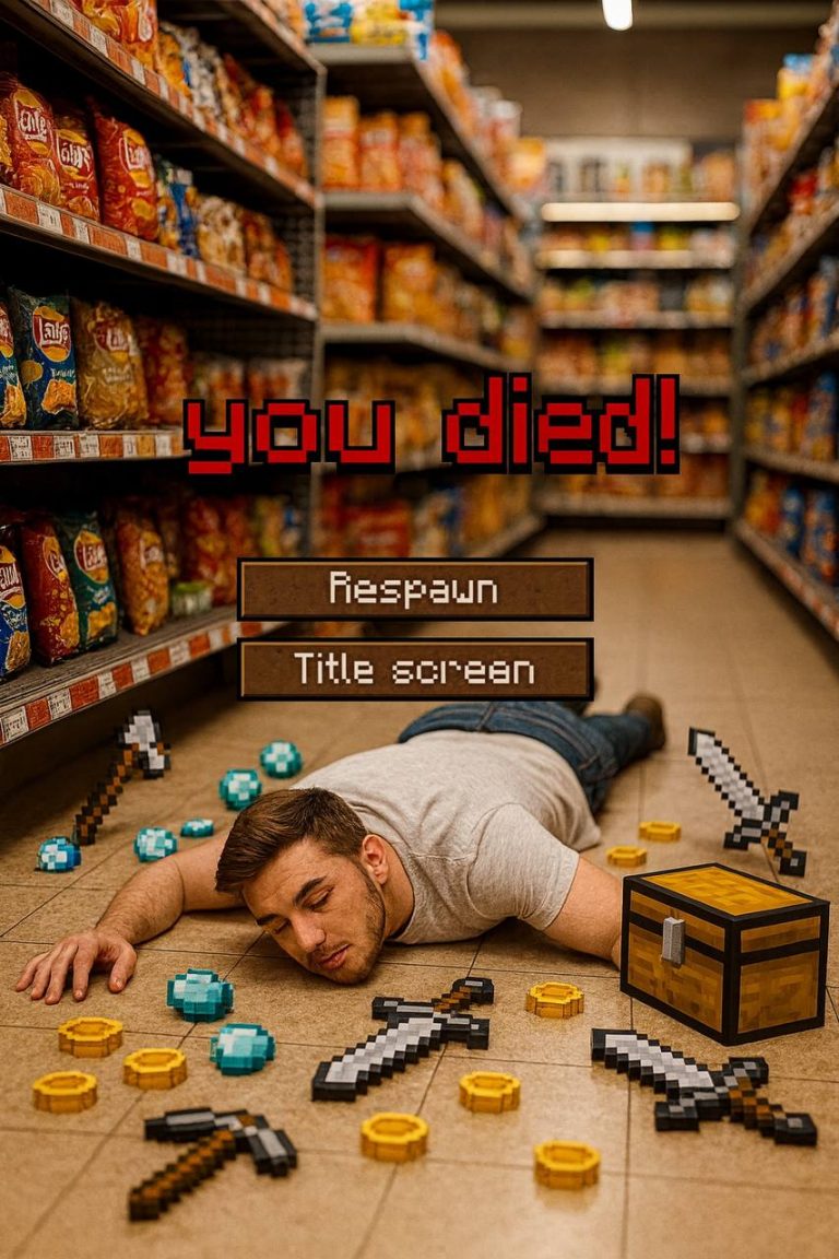 Transform this image [Upload Your Image] into a 64K DSLR shot resolution full-body portrait of A young man (same face as the uploaded image) is lying face down on the floor of a grocery store aisle, appearing to be «dead» in a gaming-themed scene. Superimposed on the image are pixelated video game elements such as a pickaxe, swords, treasure chest, diamonds, and coins scattered around him, creating a pixel-art style effect. The background features shelves stocked with snack foods and other grocery items, with a visible grocery store aisle extending into the distance. The scene also includes a game over message «you died!» and options for «Respawn» and «Title screen» in a pixelated font, mimicking a classic video game interface. Octane render & unreal engine 5.