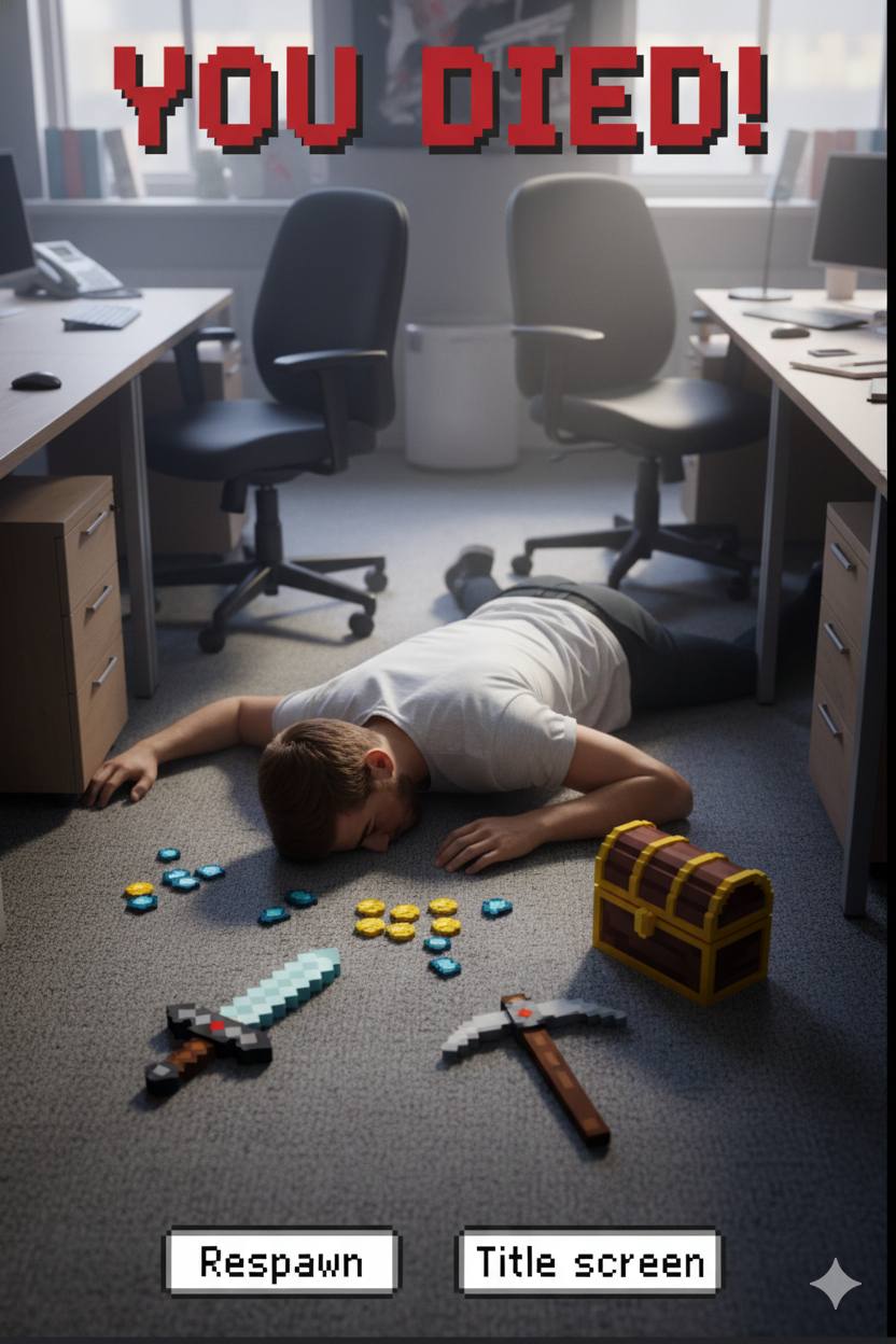 Transform the uploaded photo into a 64K DSLR cinematic render. A young man (same face as uploaded) lies face down on the office floor between desks and chairs, not looking at the camera, in a retro video game–style death scene. Add a few 3D pixel-art objects lying on the floor — a sword, a pickaxe, a treasure chest, and scattered coins and diamonds (strictly on the ground, no floating objects). Overlay “YOU DIED!” at the top and “Respawn / Title screen” buttons below in 8-bit pixelated font. Lighting: cinematic, realistic soft office light, detailed shadows, high dynamic range. Render with Octane + Unreal Engine 5, ultra-sharp textures and depth.