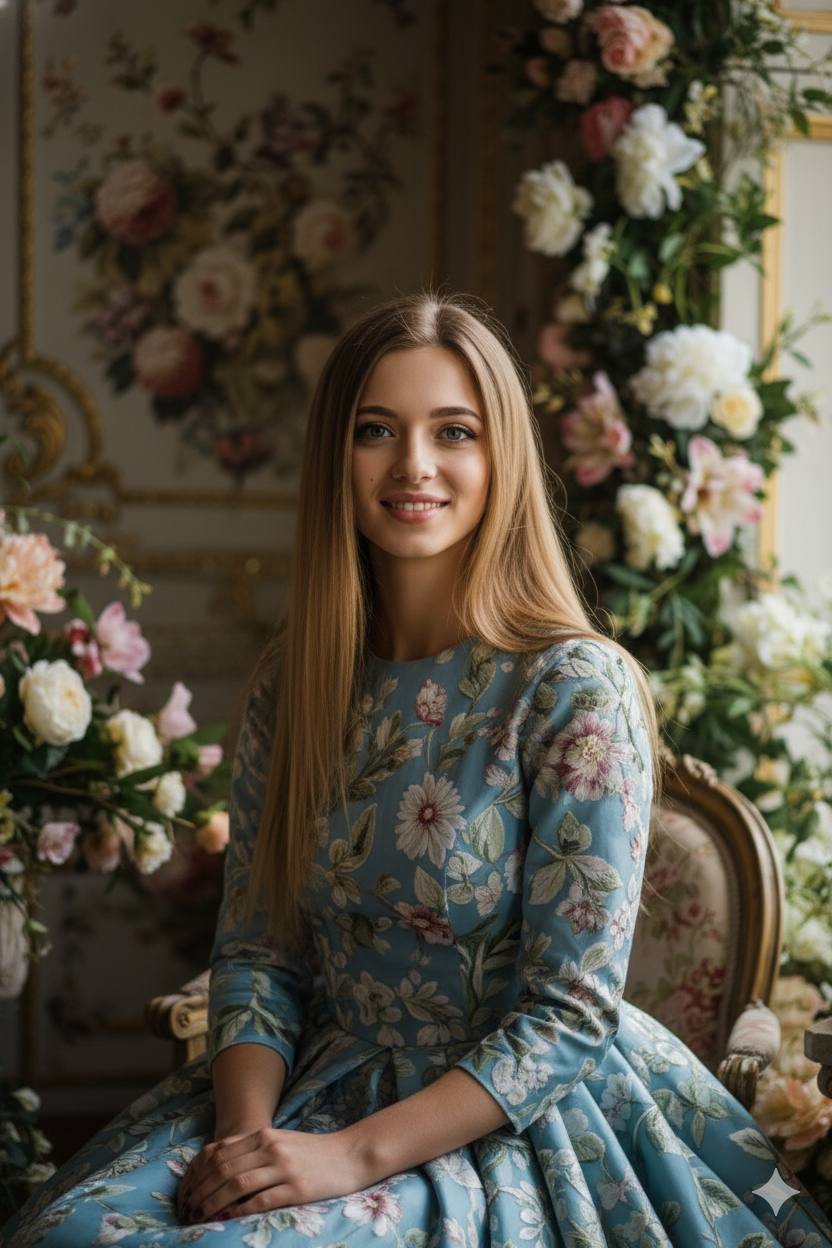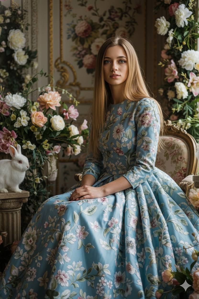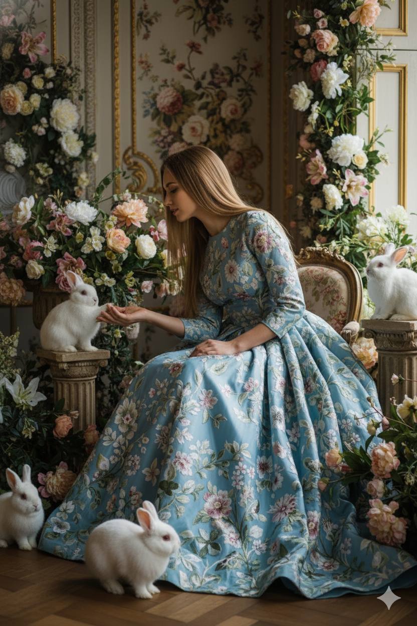 Create an 8K photorealistic portrait of a young woman sitting in an ornate floral room. Use the uploaded selfie as the only reference for her face. Reproduce her exact facial features, identity, proportions, skin tone, hair structure, and natural expression with no changes or beautification. She is seated in a relaxed three-quarter pose, body turned slightly to the left, hands resting calmly in her lap. Her head is gently turned toward the camera, with a distant, introspective gaze directed slightly past the lens. The expression must feel calm, deep, and subtly detached. She is wearing a voluminous light-blue embroidered gown with detailed floral patterns. Surround her with realistic fresh flowers, lush arrangements, and several live rabbits placed around her on the floor and nearby pedestals. Lighting: soft natural window light from the right side, with a darker, richer exposure and high-end fashion contrast. Render ultra-detailed textures of fabric, skin, flowers, and hair with full photorealism. No stylization, no painterly look, no smoothing, no artificial gloss.