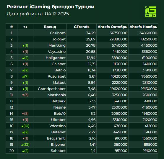 Лидерами топ-20 брендов по прежнему являются Casibom, Jojobet, однако 3-е место занял Meritking, поднявшись на одну строчку, а Vaycasino опустился на 1 позицию.