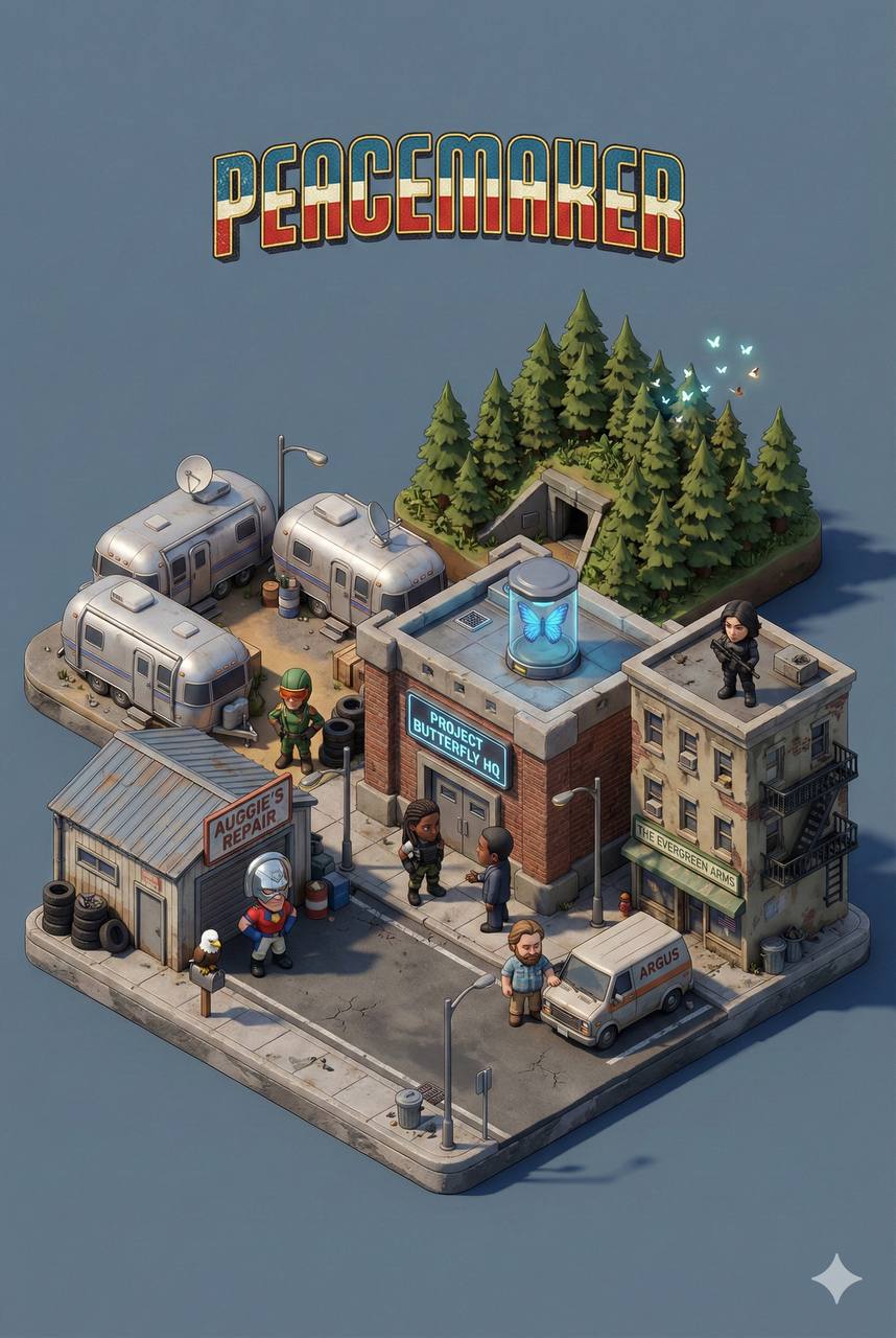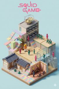 First, analyze the core world-building of [НАЗВАНИЕ СЕРИАЛА]: identify its iconic buildings, signature locations, atmosphere, props, character silhouettes, and color palette. Mentally plan the spatial arrangement and lighting of a 3D miniature isometric scene before rendering, ensuring the final output uses a 2:3 aspect ratio. Then create a 45° top-down isometric miniature 3D cartoon city block built entirely from the show’s recognizable architecture and settings, with each building and each character figure used only once, with no repeats and arranged in a dense but readable layout. All buildings and character figurines must stand together on a single base-plate platform that unifies the entire 3D miniature. Render with soft PBR materials, gentle realistic lighting, clean shadows, and a minimal solid-color background. At the top-center, place the show’s title in its authentic poster-style typography.