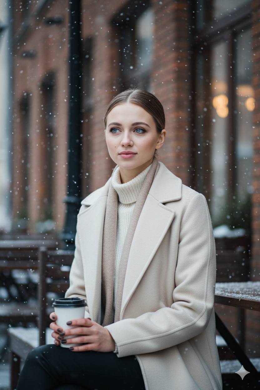 Use the uploaded selfie as the only reference. Recreate the exact same face and hair — no changes. Expression: minimal natural micro-smile. Create a winter fashion portrait of the subject sitting on a wooden bench at an outdoor city café in light snowfall. Scene: Winter café terrace; wooden bench and tables; brick building with warm window light; two lampposts behind the subject; pavement lightly covered with snow; soft falling snowflakes; clean background. Outfit: Long cream wool coat with a structured silhouette; ivory knit turtleneck; dark tailored trousers; sleek knee-high leather winter boots; neutral wool scarf resting naturally; hair pulled back cleanly. Pose: Calm upright posture; hands holding a warm takeaway cup without covering the face; gaze slightly to the side; controlled editorial stillness. Lighting: Cold diffused daylight with subtle warm reflections; slightly darkened high-fashion contrast.